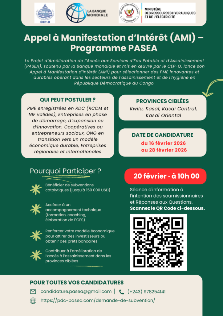 Le Gouvernement de la République Démocratique du Congo a reçu un appui de l’Association Internationale pour le Développement (IDA) du Groupe de la Banque Mondiale, pour mettre en œuvre le Programme d’Accès aux Services d’Eau et d’Assainissement en RDC, « PASEA » en sigle.